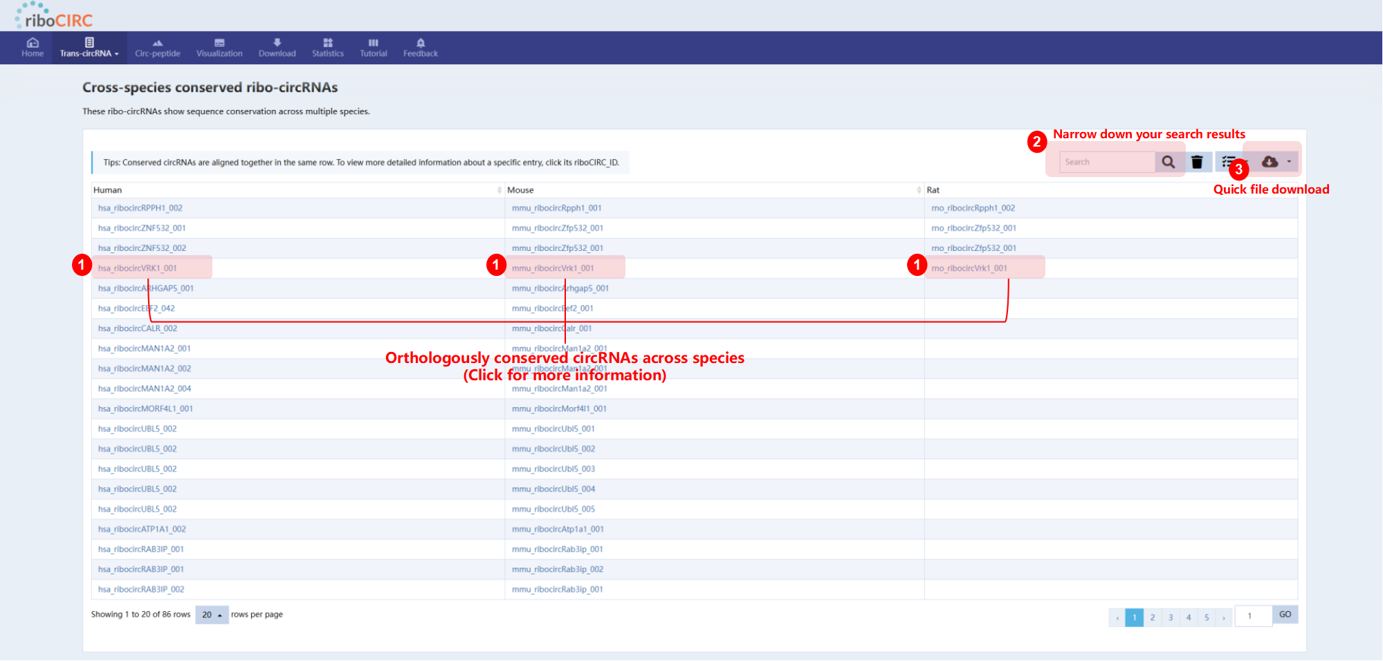 This page displays translatable circRNAs conserved across species, with conserved entries aligned in the same row for easy comparison.