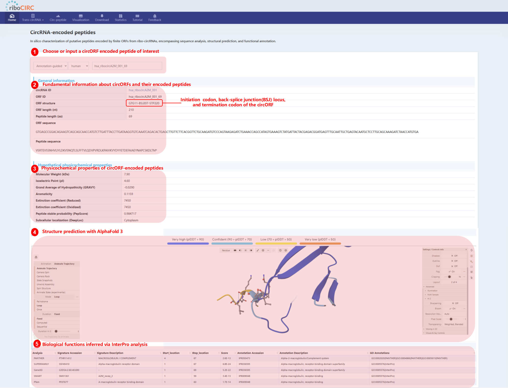 The Circ-peptide page provides in silico characterization of potential peptides encoded by finite ORFs derived from ribo-circRNAs. Choosing an item from the dropdown menu reveals detailed information encompassing sequence, structure, and function. This resource establishes a valuable foundation for circRNA translation research and offers a critical starting point for exploring the biological importance of circRNA-encoded peptides.