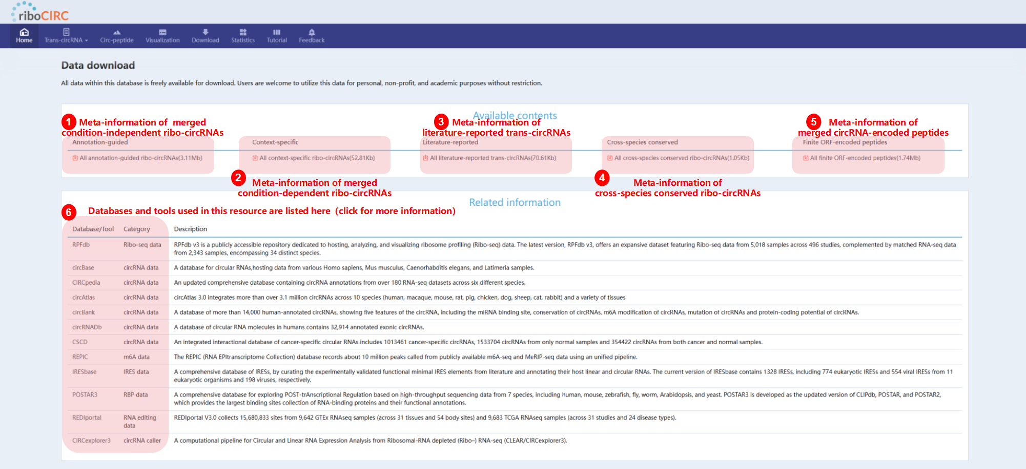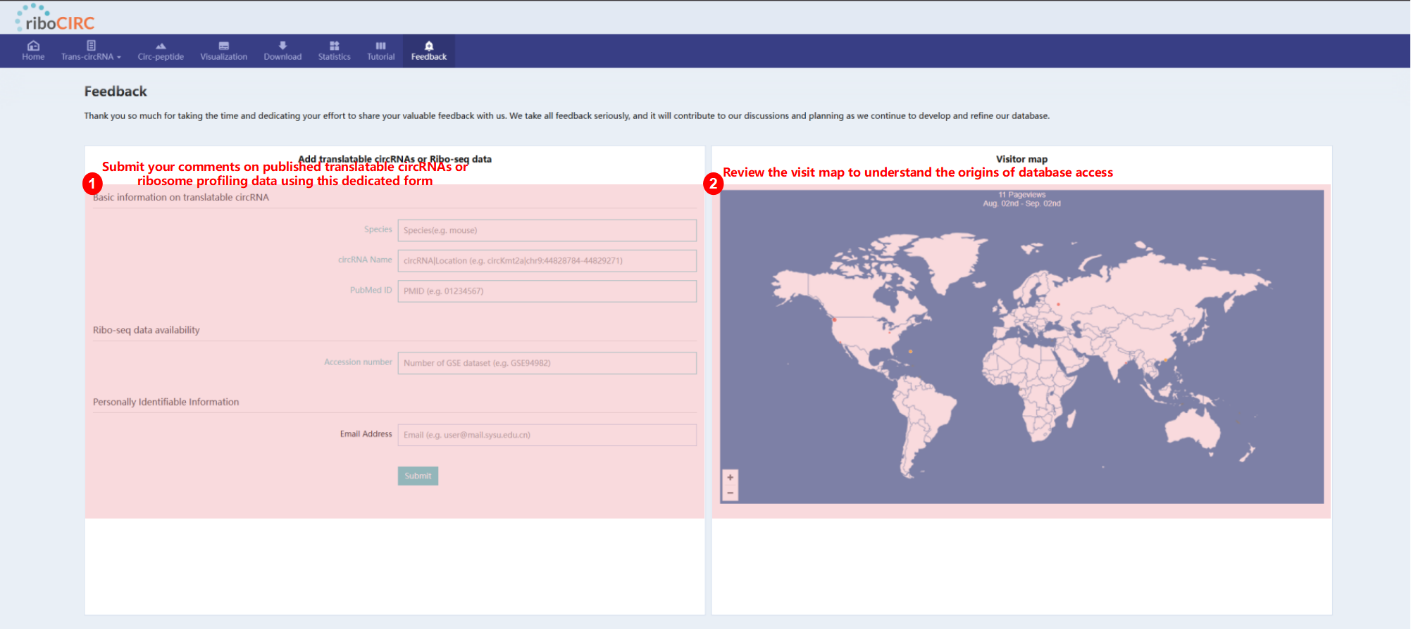 The Feedback page includes a dedicated form for comments on reported translatable circRNAs or ribosome profiling data. We welcome your specific and helpful suggestions.