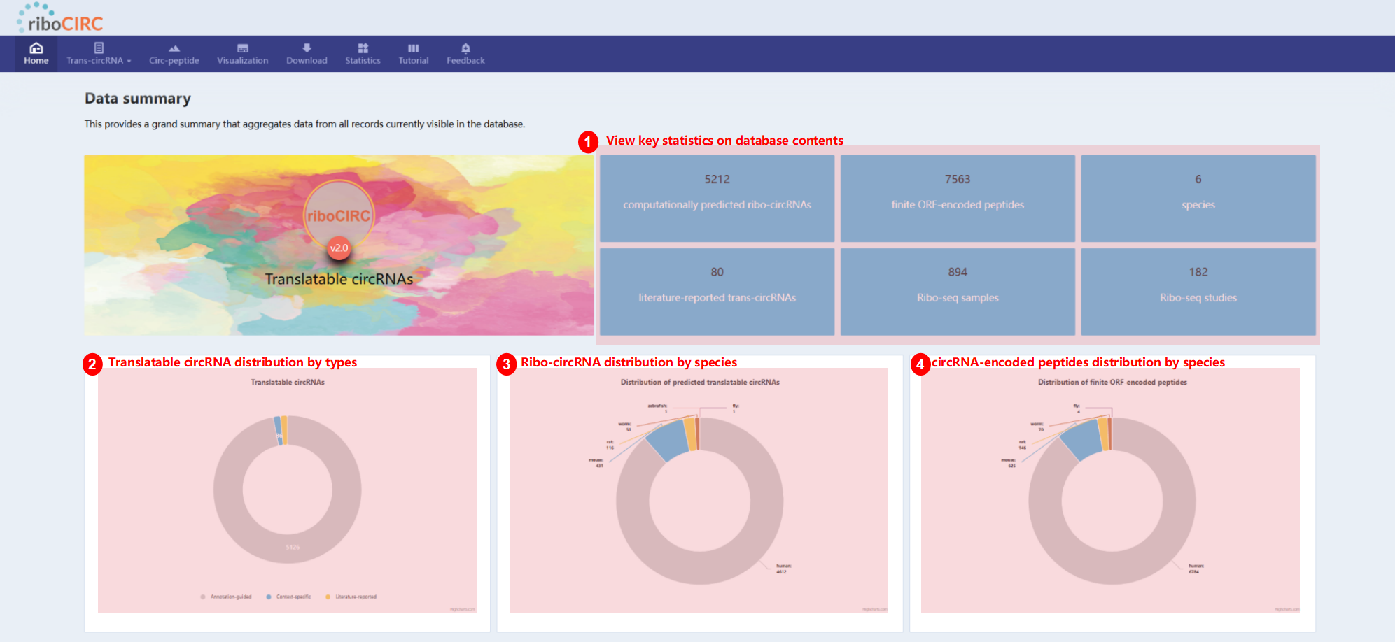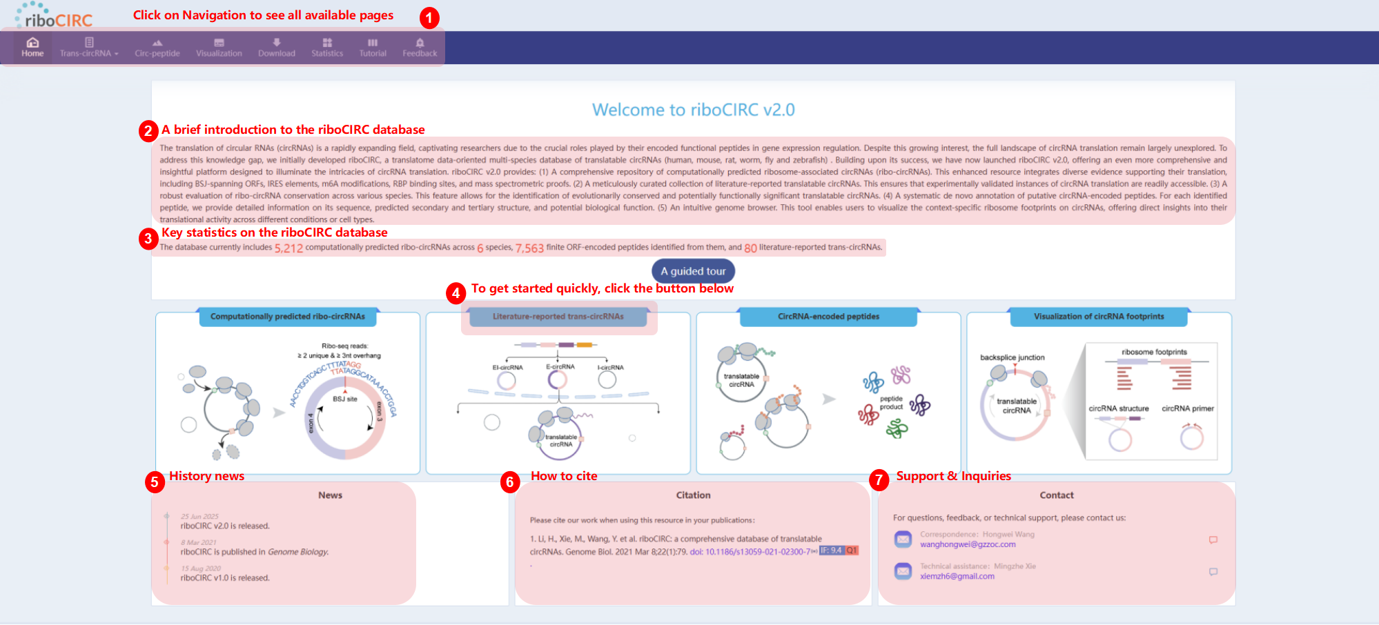 The home page serves as your gateway to riboCIRC. It features a brief introduction to the database, a summary of translatable circRNA statistics, and a Quick Start module to help you get started. You can also learn about the website's history, find citation details, and access contact information for questions or feedback. For a guided experience, click the "A Guided Tour" button to begin your online tour!