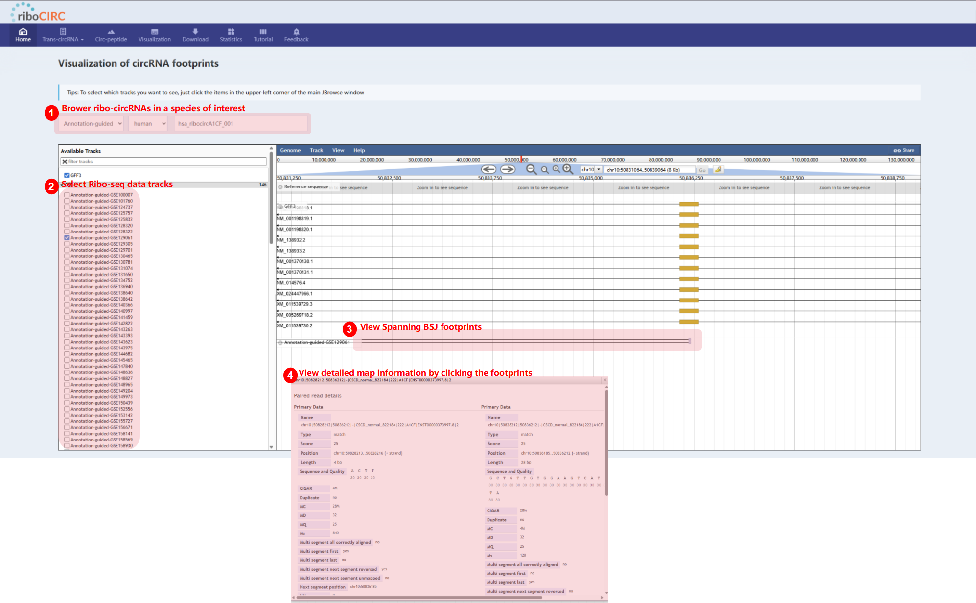 The Visualization page offers clear and interactive views of circRNA translation, highlighting junction-spanning ribosome footprints. Users can select translatable circRNAs and ribosome-profiling data tracks based on context, accessible through JBrowse's left sidebar.